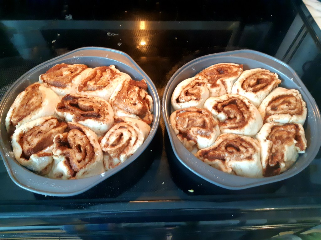 5. Place the rolls, cut side down, in a prepared pie plate. Cover with plastic wrap and tea towel, placing in a warm spot, rising for 15 minutes. (10)