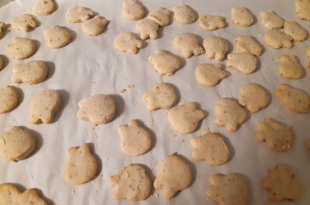 Directions 1. In a small bowl whisk together the dry ingredients (flour, baking soda, salt, nutmeg), set aside. 2. In a large bowl vigorously whip the butter with the back of your fork until fluffy (2 minutes). Add the applesauce and sugar. Fluff until well mixed (another minute). Add the flax “egg”, vanilla and apple cider vinegar/lemon juice and whisk until blended in. 3. Add the dry ingredients slowly into the wet ingredients as you stir to make a nice cookie dough 4. Divide into 3 balls and chill in the fridge for at least 1 hour (I wrap each ball individually in saran wrap to prevent drying out). 5. Preheat oven to 350 degrees. Line baking sheet with parchment paper 6. Between 2 pieces of parchment paper, roll out one ball of dough until 1/4″ thick. Using mini animal cookie cutters cut out your cookies. 7. Carefully transfer to the baking sheet and bake for 8-10 minutes, just until the edges begin to lightly brown. 8. Allow to cool on a wire rack, enjoy. Will store in an airtight container for up to 1 week on the counter. Freeze in airtight container for longer lasting crackers, take out prior to enjoying.