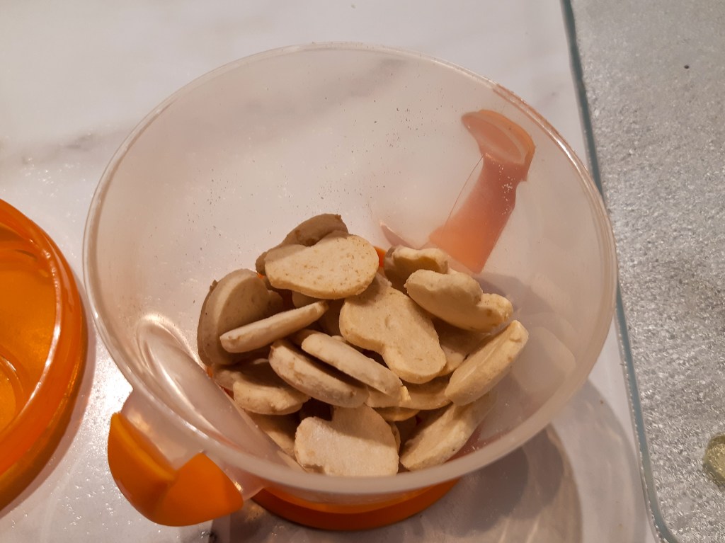 I use little cutouts that I got off of amazon that are actually meant for fruit, veggies and cookies. Super little and super cute. You can use whatever shapes you want, I love making them in shapes my daughter recognizes like bunny ears or fish etc, but circles work just as good. I like them small as they are great for little fingers (a little bit bigger than my thumbnail is my go to).