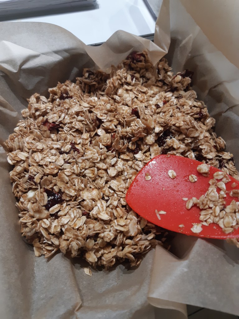 Place in prepared baking sheet. Using a rubber/silicone spatula press the mixture into the pan, spreading around evenly. Fold parchment over & press with your whole body weight to ensure it is well compressed throughout.