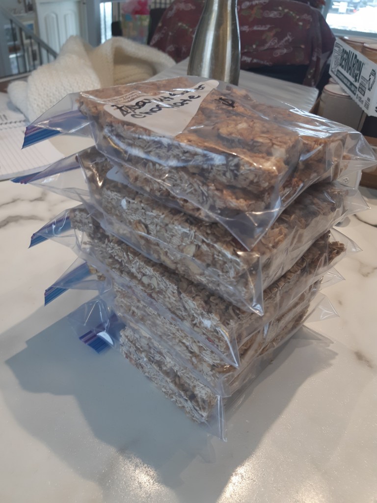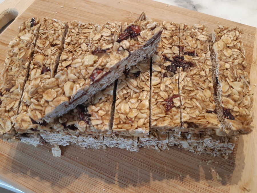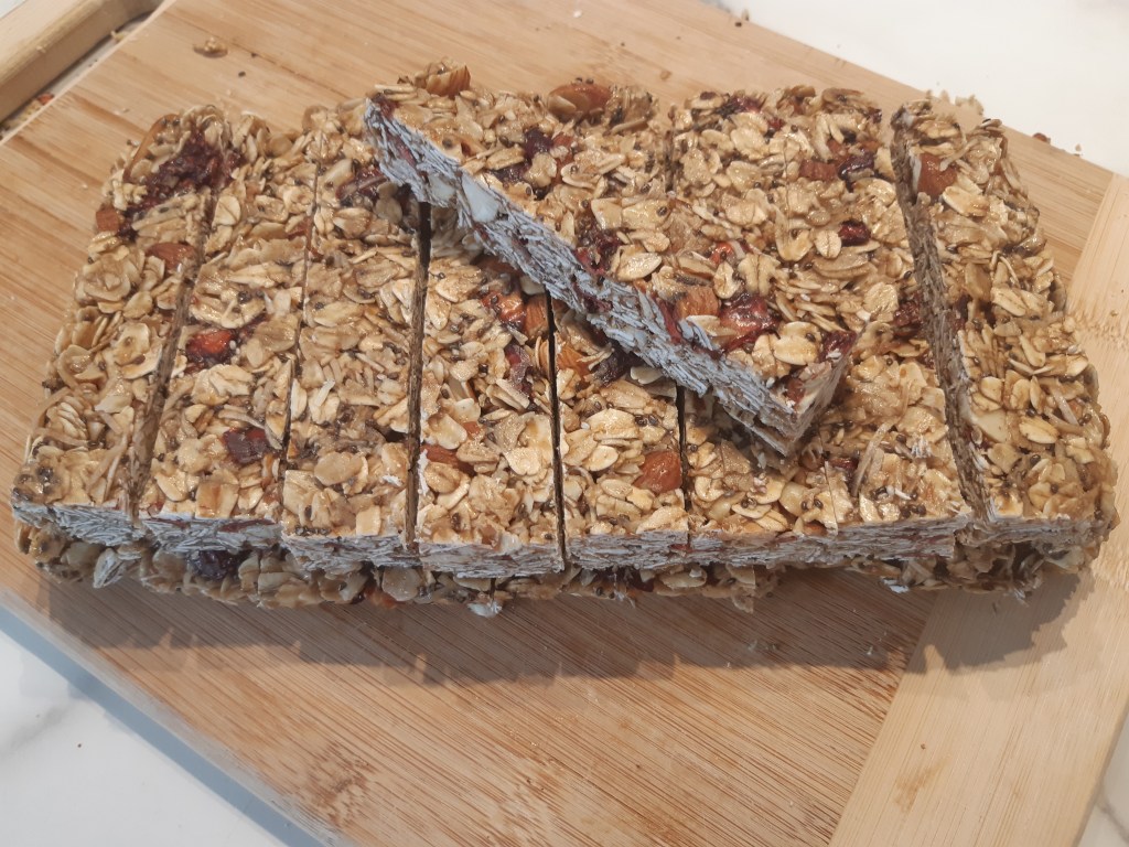 2 1/2 C old fashioned rolled oats 1/2 C nuts, roughly chopped (1) 1/4 C honey (2) 1/4 C unsalted butter (or alternative, we use miyokos) (3) 1/3 C brown sugar/coconut palm sugar (4) 1 tsp vanilla extract (5) 1/4 tsp salt (6) 3/4 C total extra mix-ins (see Mix Ins – Granola Bar Recipe below)